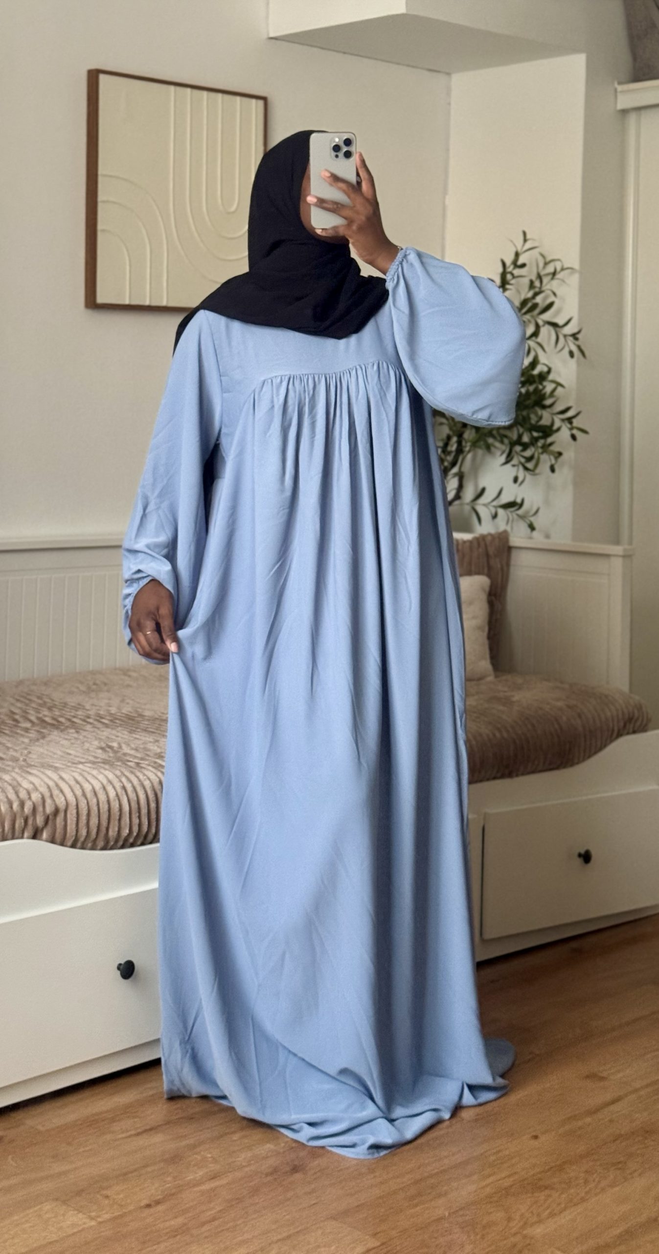 Robe longue, manche ballon, manche élastique aux poignées.